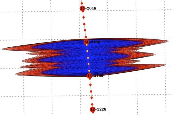 在以往压裂过程中,投放暂堵剂之后只能依靠施工压力曲线来判断是否暂堵成功,而广域电磁法压裂监测技术却可以凭借云平台技术在电脑屏幕上以动态图的方式生动形象的展示暂堵后裂缝长度究竟如何延申。从图中可以看出在压裂后期投完暂堵绳结和暂堵剂后,西侧2簇孔进液明显增加,3簇孔则受到了一定抑制导致进液缓慢,证明本次暂堵有效,整体改造效果较好。
